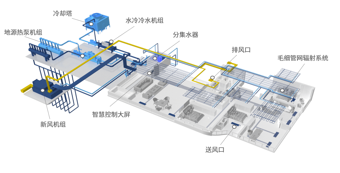 集中冷熱源系統(tǒng)集中地源熱泵系統(tǒng),冷卻塔和鍋爐做為輔助。